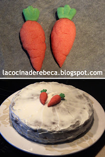 En la red hay muchííííísimas recetas de carrot cake (un nombre mucho más sofisticado que tarta de zanahoria), esta es una adaptación hecho a partir de varias de esas recetas. La mayoría, además de zanahoria, llevan piña, pera, manzana... pero pensé que las nueces (que me encantan) y las pasas, a este tipo de bizcochos, le irían bien. Y después de probarla, os aseguro que le quedan muuuuuy bien ;)